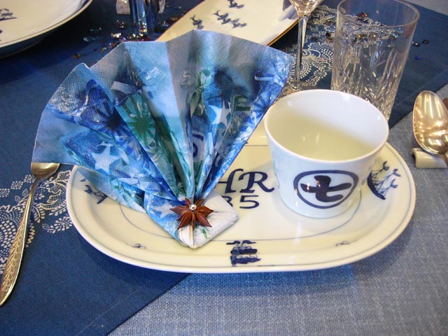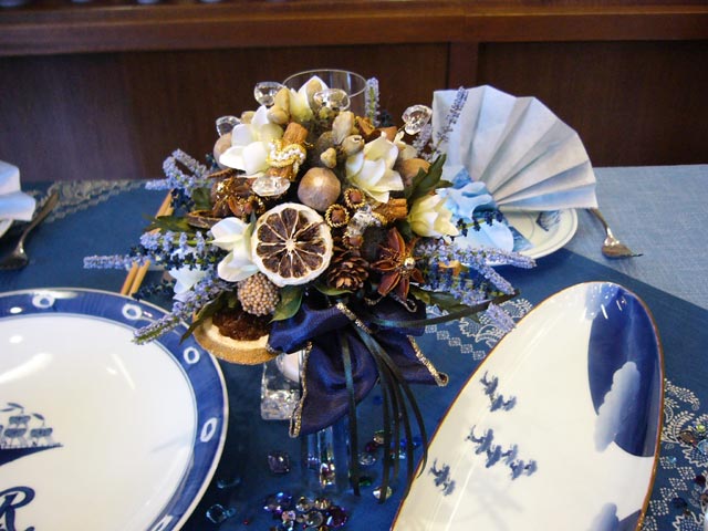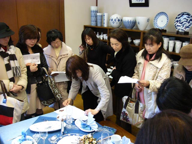 工房案内の後は、テーブルセッティングの勉強会。先生が実際にお使いになられている、器とテーブルクロスほか一式を用いて開かれました。ロイヤルブルーに演出されたテーブルは、とても華やかで気品でありながら、どこのご家庭でも取り入れられる身近なセティングでした。着飾られたデコレーションではなく、ちょっとした工夫でおもてなしの演出ができる事を教えてくださいました。