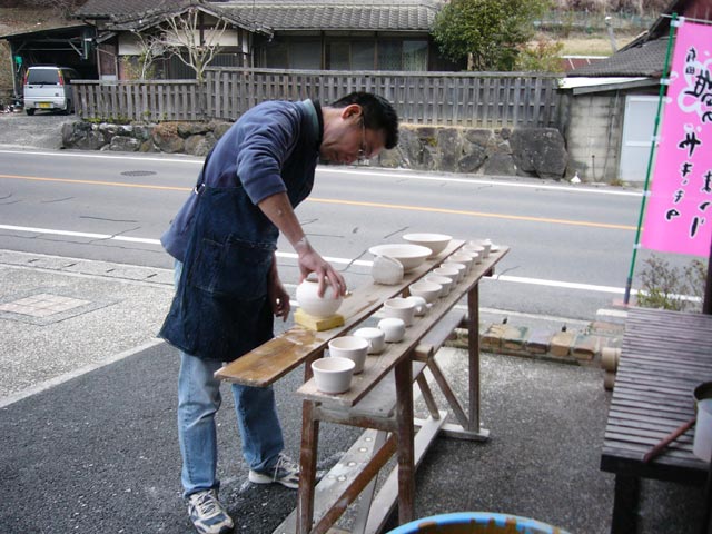 登り窯焚き準備 今日夕方より今年最初の登り窯が焚かれます。今回の窯は主に、第9期生の卒業作品で占めていて、半年間学んできた成果が試されます。(2008/2/22)●教室「花座」の前で準備スタート●たくさんの作品に釉薬がかけられました●可愛いゾウさんの置物です●丁寧に高台部分の釉薬をはぎます●現場監督の「まるちゃん」…静かに見守っています●側に来て何か話したい様子●急斜面を何度も運ぶ姿はまさに職人芸●火の通りを考えて、慎重に窯を積みます●窯の中から一枚 2008.02.22 20:54 青花匠日記