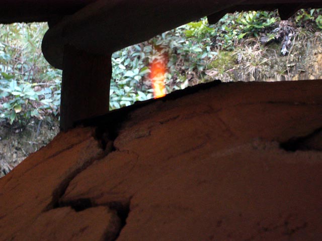 先週末に焚かれた登り窯の様子を報告します。前日夕方から5~6名による炎のたすきを手渡して朝方となりました。炉内温度は千度を超え、下の焚口から横の焚口へ移動します。目印は炎の長さで、常時一定の長さを維持しなければなりません。時に放射熱で髪の毛や肌をヤケドしそうになる場合もあるので、細心の注意を払いながら挑みます。どうか無事に焚けますように!