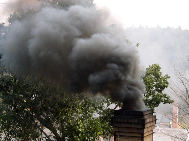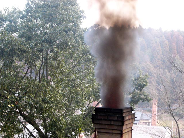 ●薪を入れ込み、蓋を閉じた瞬間です。よく見ると煙突付近に火柱が出ています