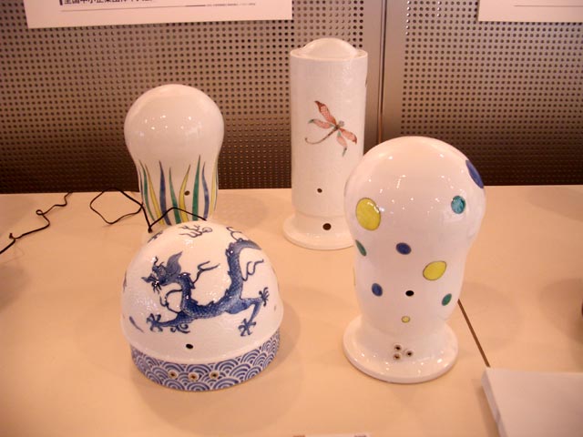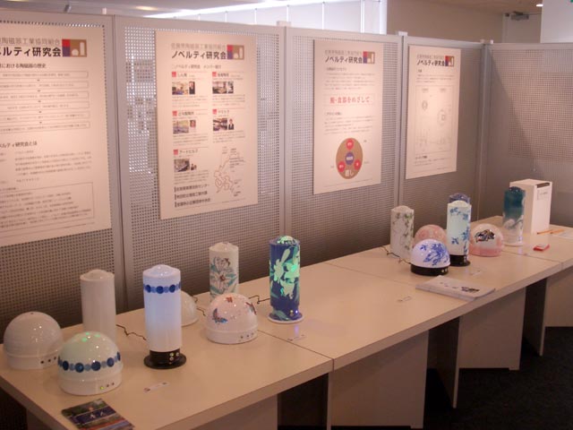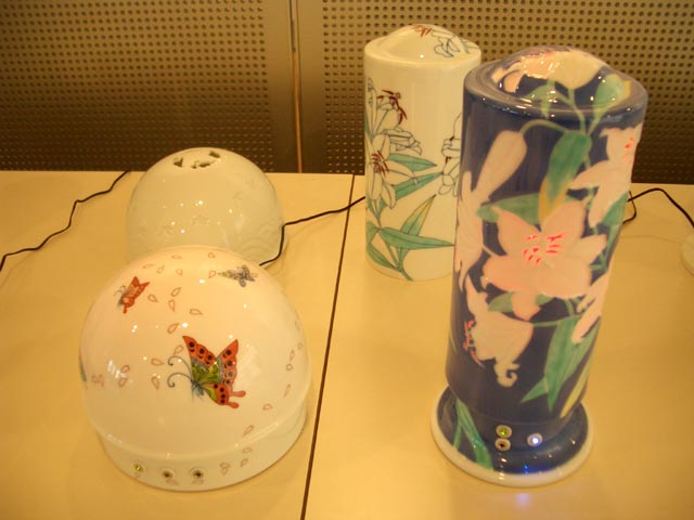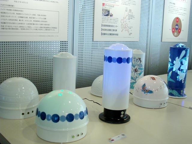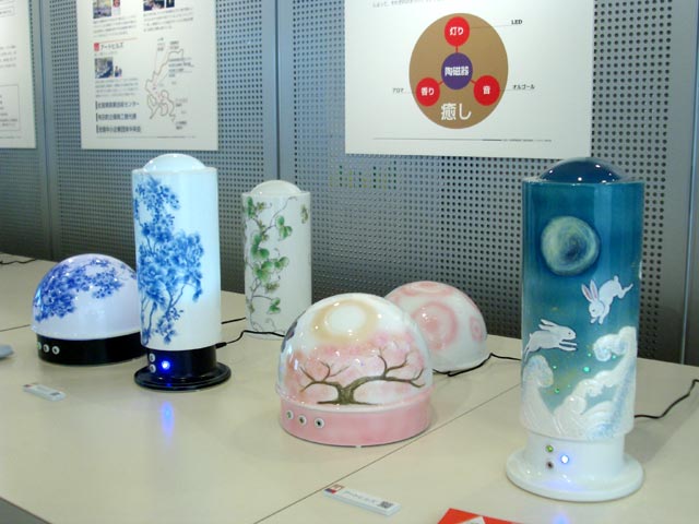 九州の地域ブランドの在り方を発信されていますが、今回、有田ノベルティ研究会(弊窯当主会長)より「灯り展」を提案されました。透光性をもつ磁器素材を用いた灯りに、アロマとオルゴール、そして七色に輝くLEDなどの付加価値を備えています。中でも畑萬さんの製品はとても人気。見ているだけで心から和まされ癒されました。