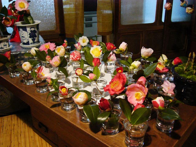 ●土間から上がる所に、色とりどりの椿が迎えてくれます。左側に青花の鉢も飾ってありました。