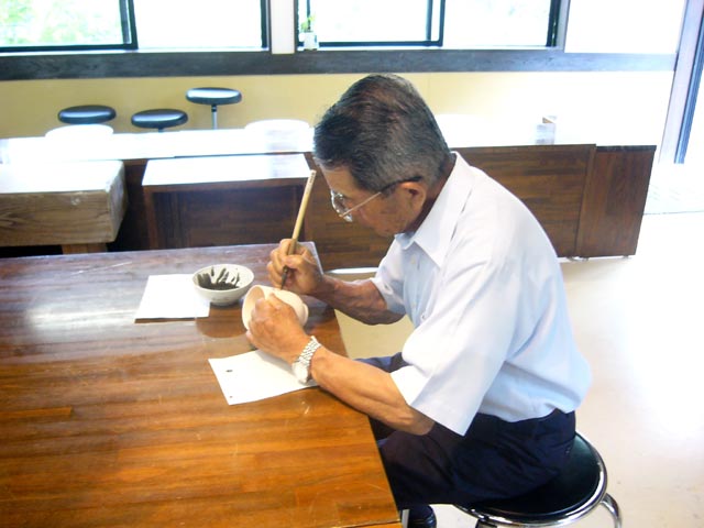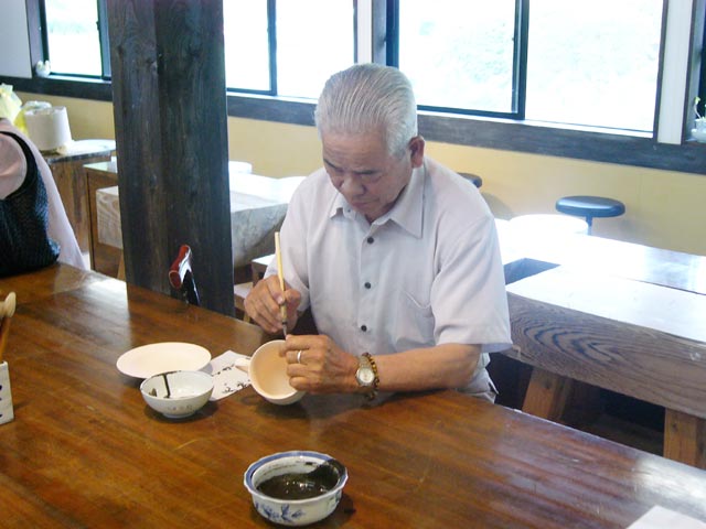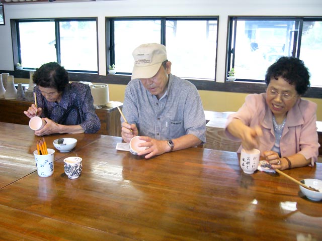 ご年配の皆様 隣町よりご年配の御一行様がお見えになられました。工房見学組みと絵付け体験組みにわかれて、それぞれに楽しんでいただいた様子です。男性の方は女性スタッフに集中。いやはや皆さんとてもお元気でした。(2009/7/10)●筆のにぎりは力まずスラスラと描かれていました。●こちらの方も真剣そのもの●仲良くみんなで絵付け体験。●工房組みも積極的に話しかけてくれました。 青花匠日記