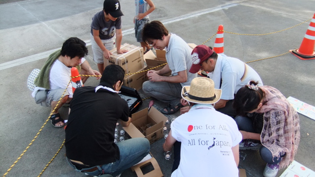 設営の最中に「絆」の意味を親子で語り合う光景をいくつか見ました。被災地の復興を願うイベントに参加させていただいたおかげで、私達も幸せな気分になりました。(2011/7/25)