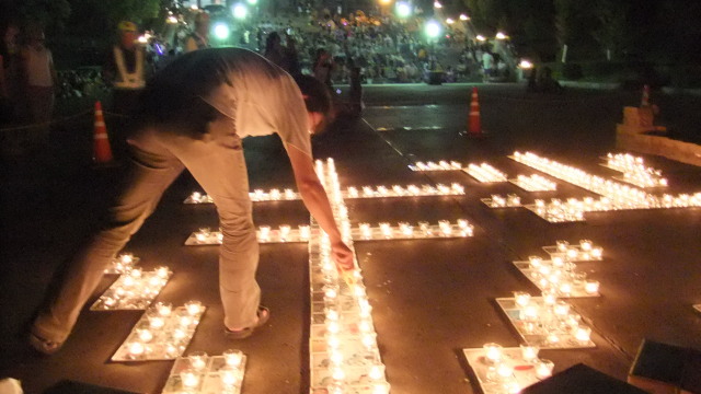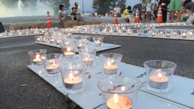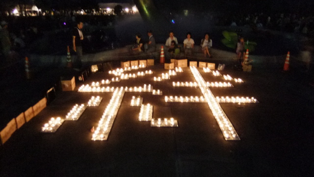 その数、約400枚。微力ながら私達も応援に駆け付けては、出来る限りのお手伝いをいたしました。夜はキャンドルに火が灯され、幻想的な「絆」の文字を多くのお客様が写真に撮られていました。