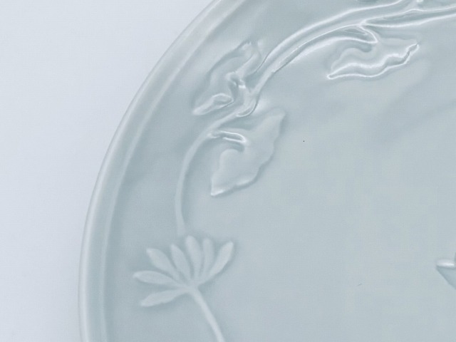 陽刻唐草帆船丸皿 しん窯青花刻